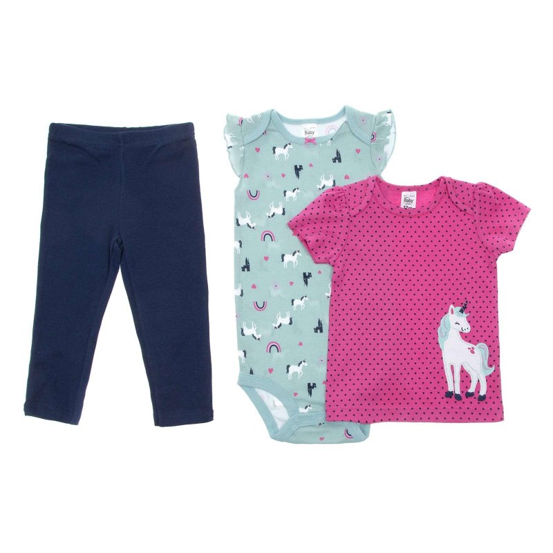 Viste a tu bebita solo con lo mejor. Este conjunto Precious Baby by Carters es una opción para combinar la comodidad y el buen gusto. Está confeccionado con fibras de algodón, que regalan confort y frescura para el día a día. El pañalero y la blusita están estampados con tiernos unicornios, y el pantalón es liso con un lindo bordado de corazón y arcoíris en la parte trasera. Es un conjunto que potenciará su tierna imagen. Anímate a agregarlo a tu carrito de compras.
